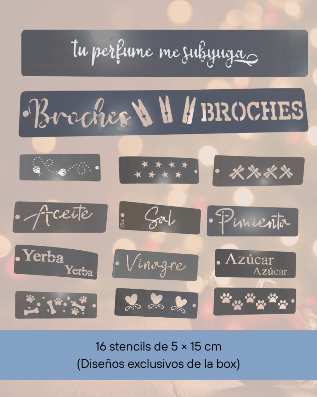 16 stencils de 5 × 15 cm (para pequeños detalles)